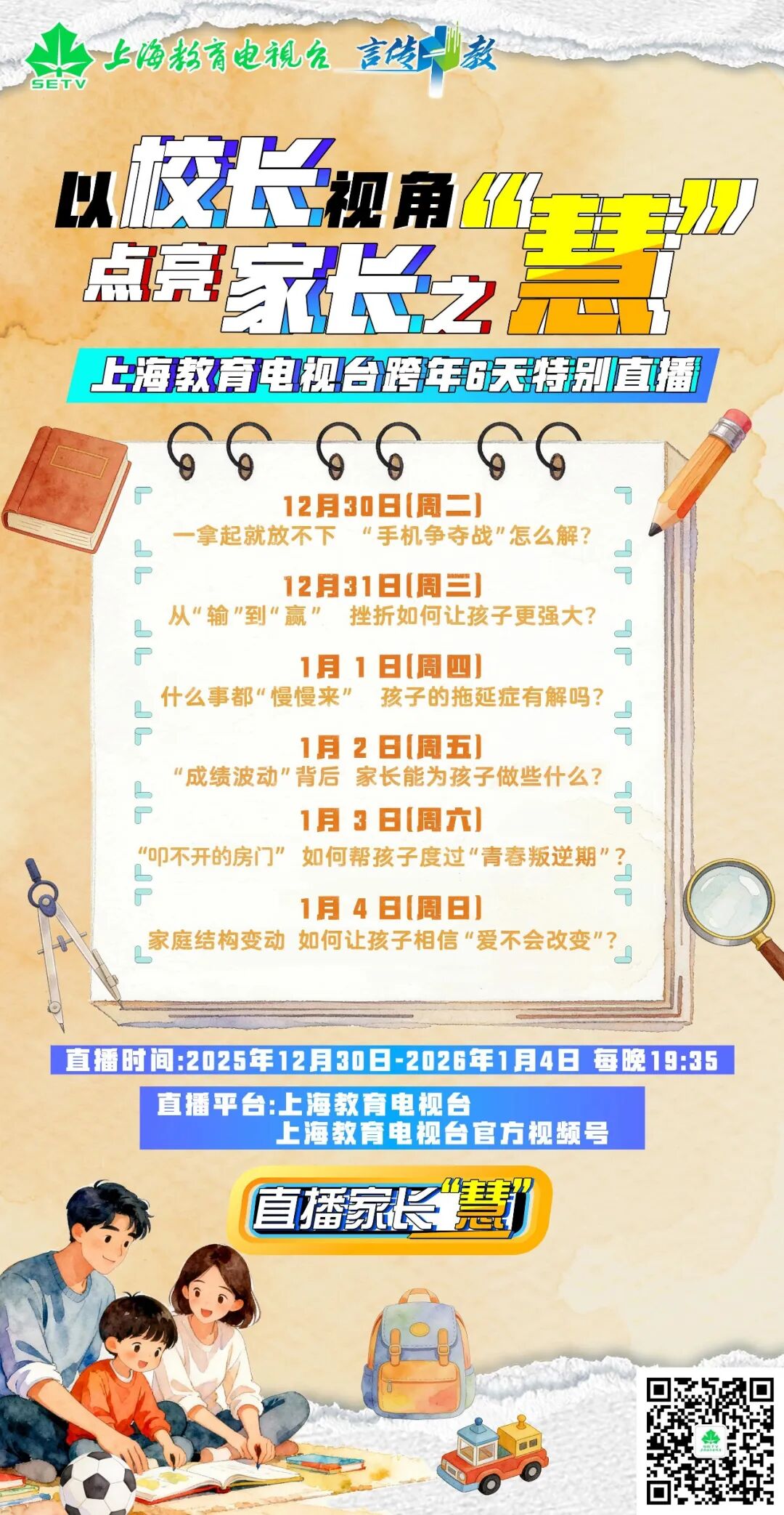 从2025年12月30日晚上起,上海教视《直播家长“慧”》跨年直播开启,共6次线上“家长会”一直开到2026年1月4日。从手机争夺战,到青春叛逆期,每晚一“会”,聚焦亲子教育难题,校长专家云端支招。