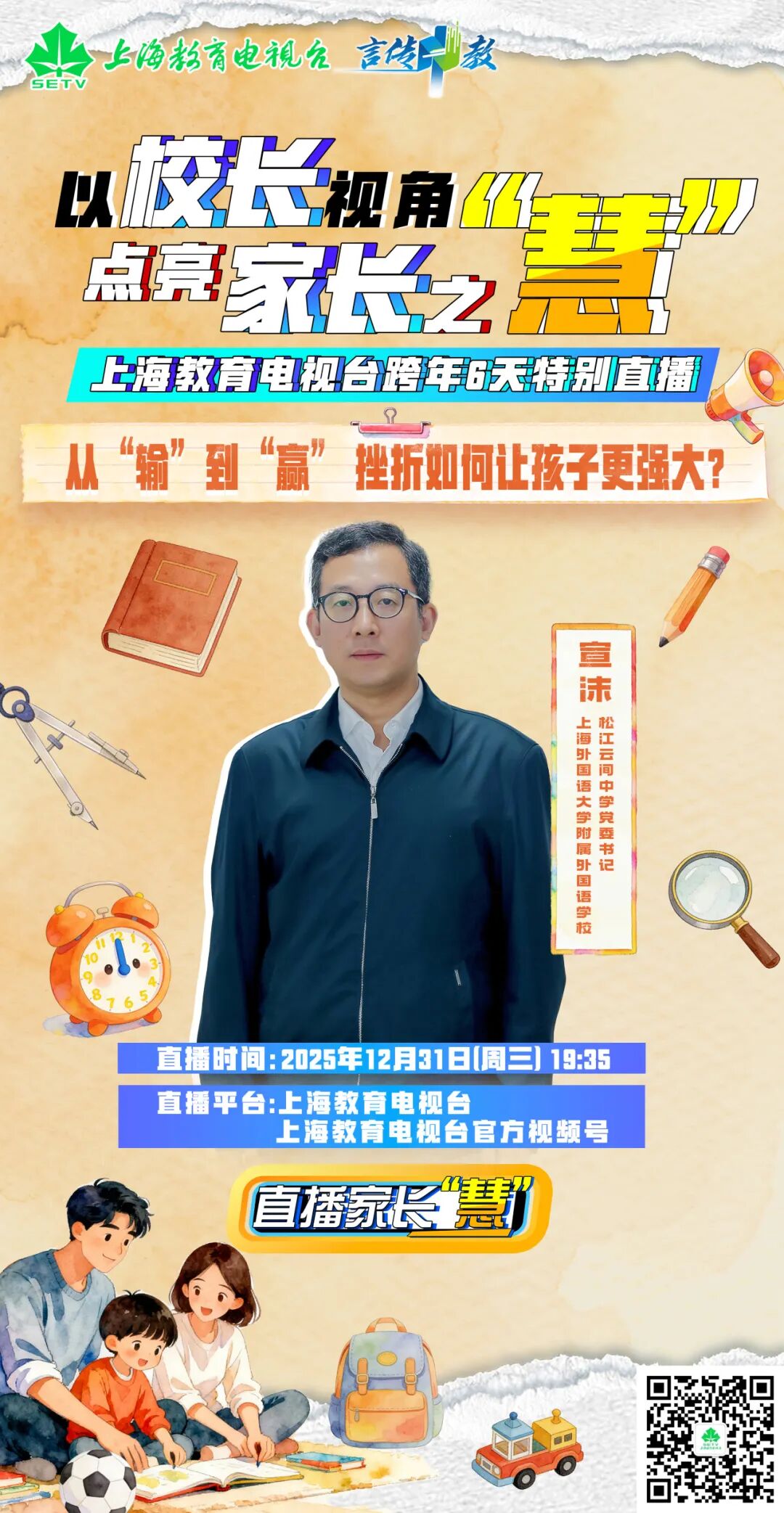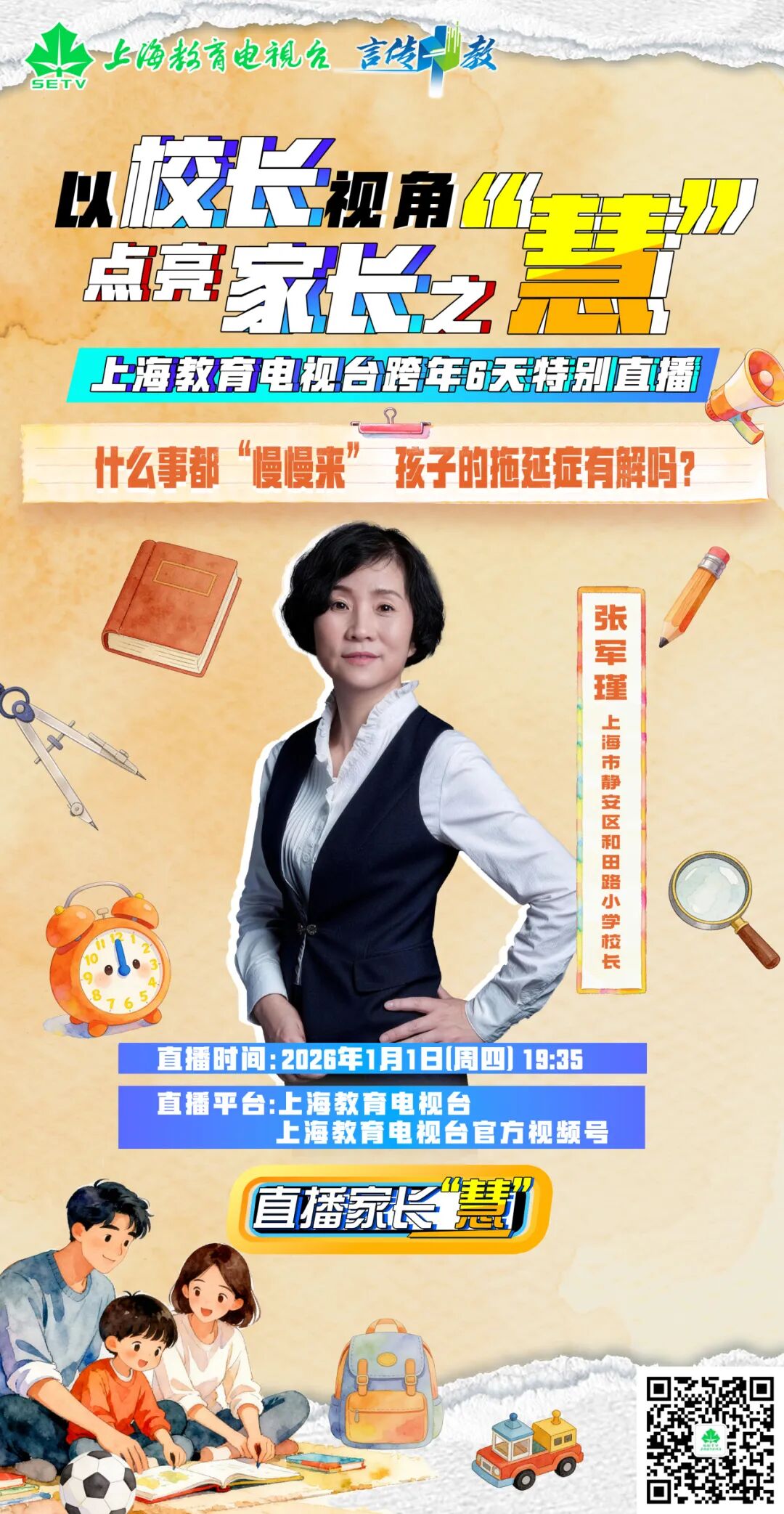 除了直击手机管理这样的家庭教育痛点,《直播家长“慧”》话题还涵盖挫折教育、习惯养成、成绩波动、青春叛逆、家庭结构变动,结合真实案例层层解析,为家长提供科学、可操作的行动建议,找到适合自己家庭的教育路径。此次跨年直播,在上海教育电视台及多个新媒体平台同步播出,家长还能实时参与互动,提出问题与困扰。