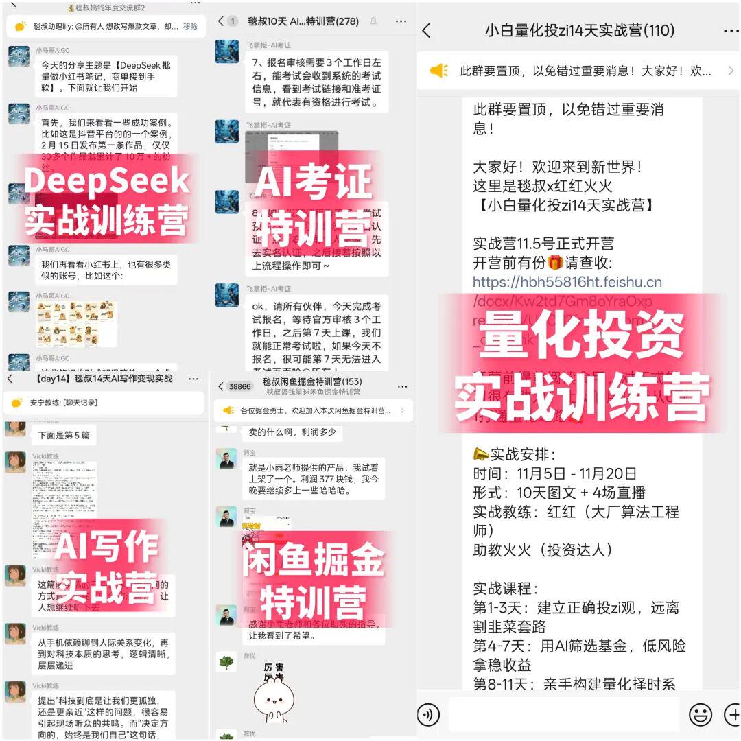 5次热门搞钱项目特训营,包括DeepSeek、AI写作、闲鱼变现、AI考证,量化投资等热门项目。超1000人参加实战打卡,90%参与者跑出正反馈!